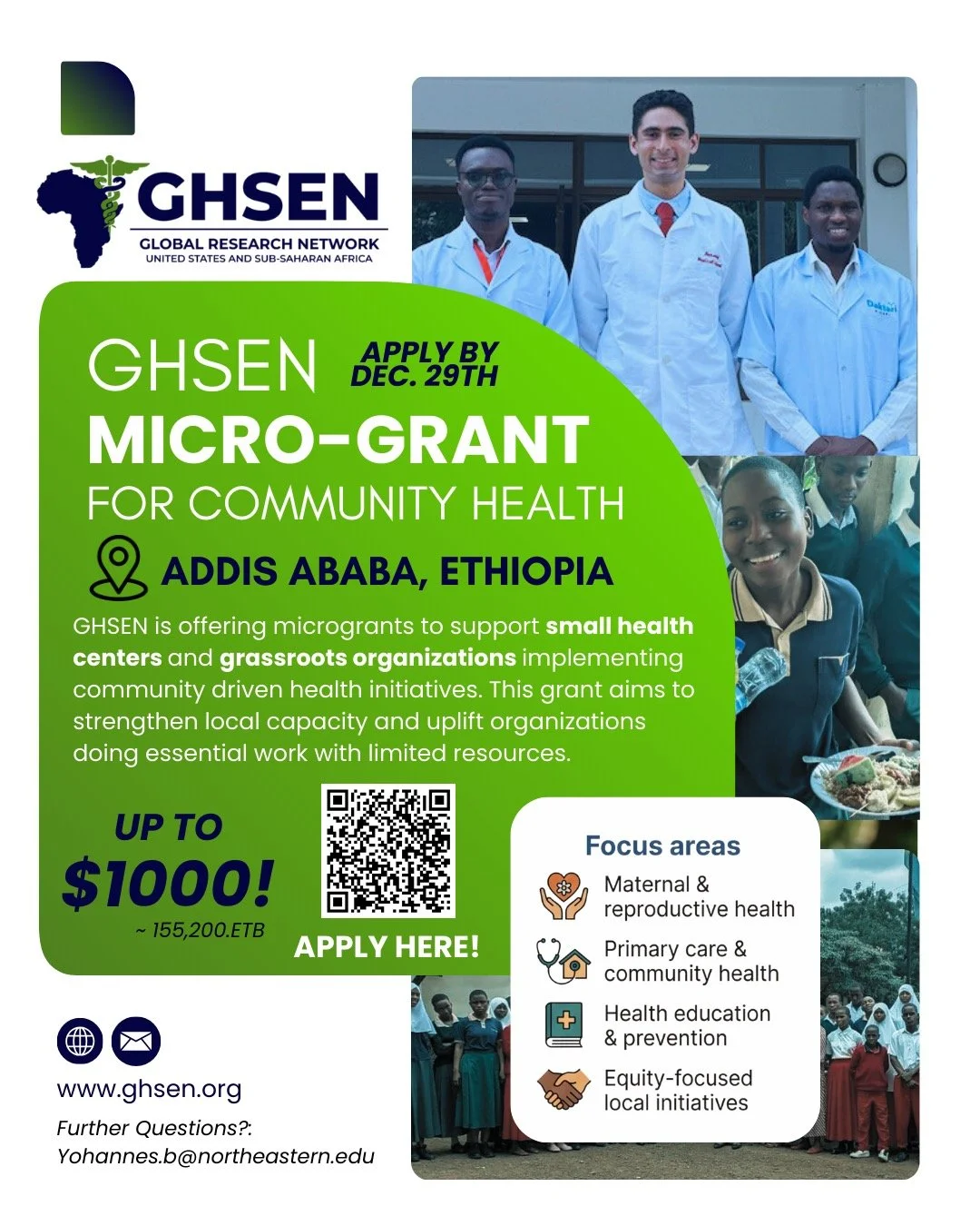 GHSEN microgrants are intended to support health clinics in sub-Saharan Africa and improve services, infrastructure, or patient outcomes, particularly those with limited diagnostic capacity and chronic resource gaps. The $1,000 grant can be especially impactful for purchasing essential equipment like blood pressure cuffs and glucometers 🫀🩺, strengthening cold-chain reliability for vaccines and medications 🧊💊, and stocking essential medications 🧪🧼, but applicants are welcome to propose their own strategy for use of these funds. The microgrant will be awarded on a competitive basis.